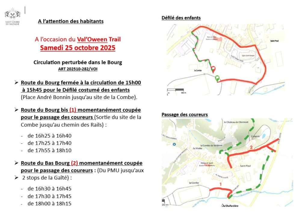 A l’occasion du Val’Oween Trail , samedi 25 octobre à partir de 15 h, la circulation dans le Bourg sera perturbée.